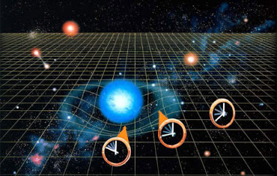 एक और उदाहरण के अनुसार चलती रेलगाड़ी में रखी घडी उसी रेल में बैठे व्यक्ति के लिए सामान रूप से चलती है क्योकि दोनों रेल के साथ एक ही गति से गतिमान है परन्तु वही घडी रेल से बाहर खड़े व्यक्ति के लिए धीमे चल रही होगी । कुछ सेकंडों को अंतर होगा । यदि रेल की गति और बढाई जाये तो समय का अंतर बढेगा और यदि रेल को प्रकाश की गति (299792.458 किमी प्रति सेकंड) से दोड़ाया जाये (जोकि संभव नही) तो रेल से बाहर खड़े व्यक्ति के लिए घडी पूर्णतया रुक जाएगी ।